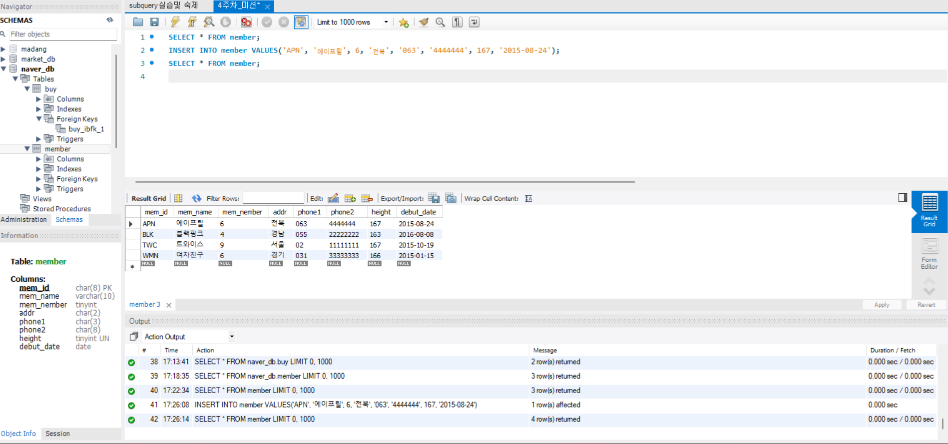 🐯 Chapter 05 p. 226 - market_db의 회원 테이블(member) 생성하고, p. 229 - 데이터 입력한 후 인증샷