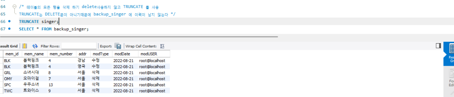 TRUNCATE는 DELETE문이 아니기때문에 backup_singer 에 이력이 남지 않는다 */