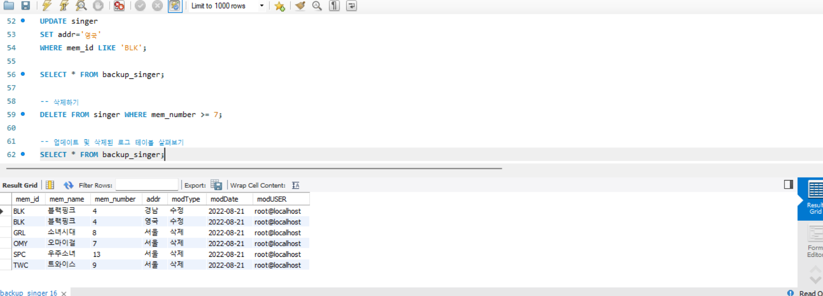 /* 업데이트와 삭제가 발생할 때 작동하는 트리거를 singer테이블에 부착 */