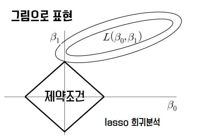 가중치의 절대값의 합을 최소화하는 것을 추가적인 제약 조건으로 한다. 라쏘는 제약조건이 절대값이라 아래의 그림처럼 마름모꼴의 형태로 나타납니다. 릿지회귀와 비슷하게 OLS의 RSS 값을 크게 늘려줍니다.